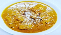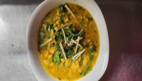 yellow lentil soup w/onion garlic ginger carrot, green peas,coconut milk, deiced chicken& curry leaf.